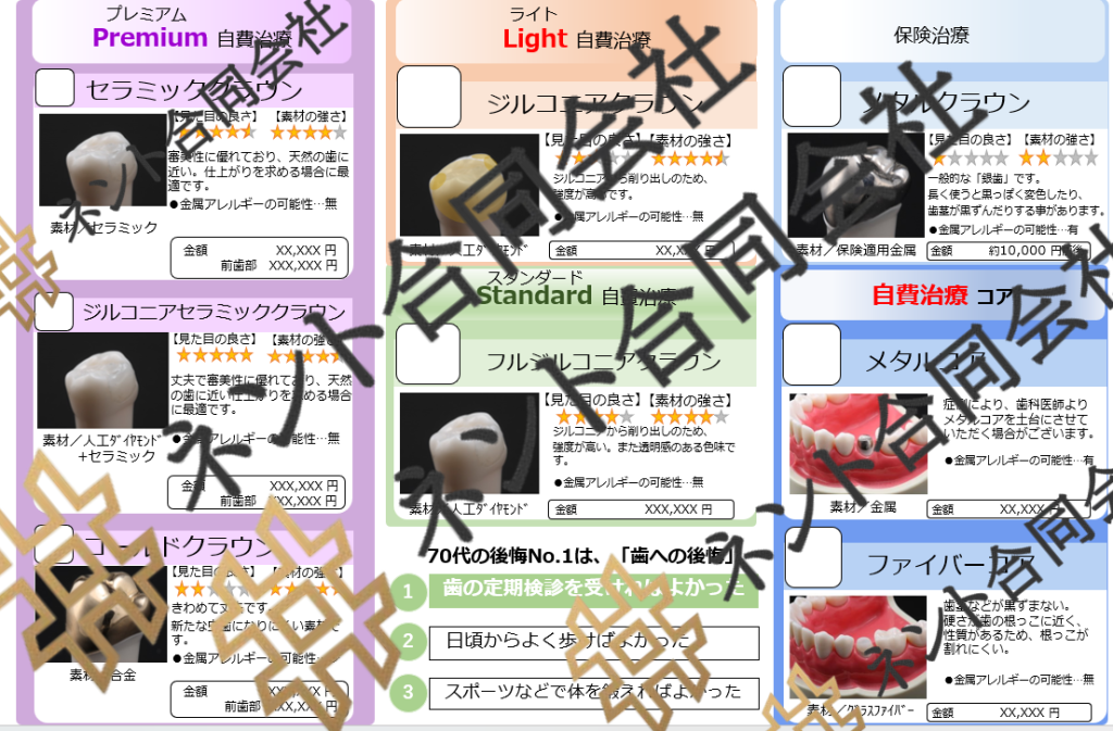 このセットは、患者さんが詰め物(インレー)や被せ物(クラウン)の治療方法を選ぶ際に、各素材の特徴や違いをひと目で比較できる資料です。