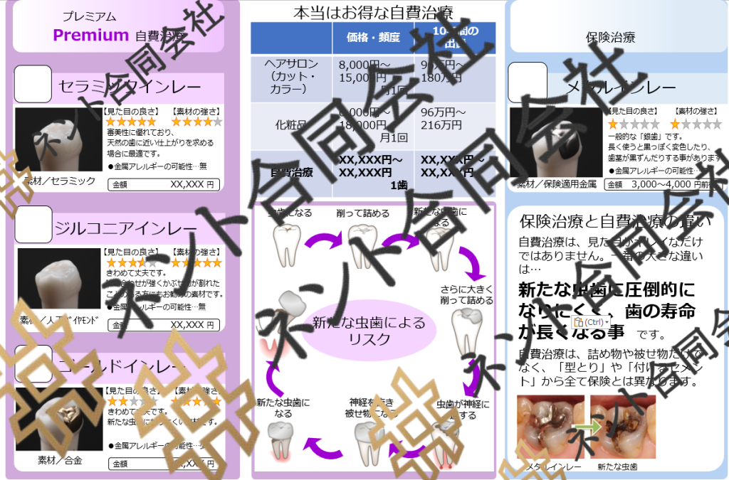 インレーとクラウンの素材別違いを比較できる説明資料セット。治療選択の案内や自費診療の提案に役立つ、カウンセリング・持ち帰り用ツールです。